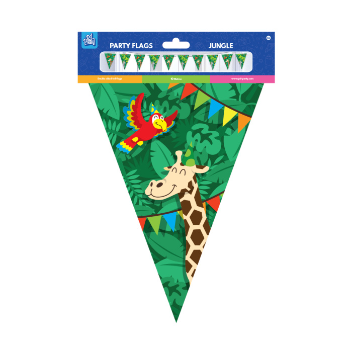 De vlaggenlijn met jungle thema is de ideale versiering op een jungle feestje. Door de gebruikte kleuren en het vrolijke design vallen deze party vlaggen dan ook extra goed op! De vlaggetjes zijn gemaakt van folie (dubbelzijdig bedrukt), hebben een lengte van 10 meter. Naast vlaggenlijnen is er nog veel meer jungle feestversiering, zoals feestelijke ballonnen, party tape, huldeschilden of swirl decorations.