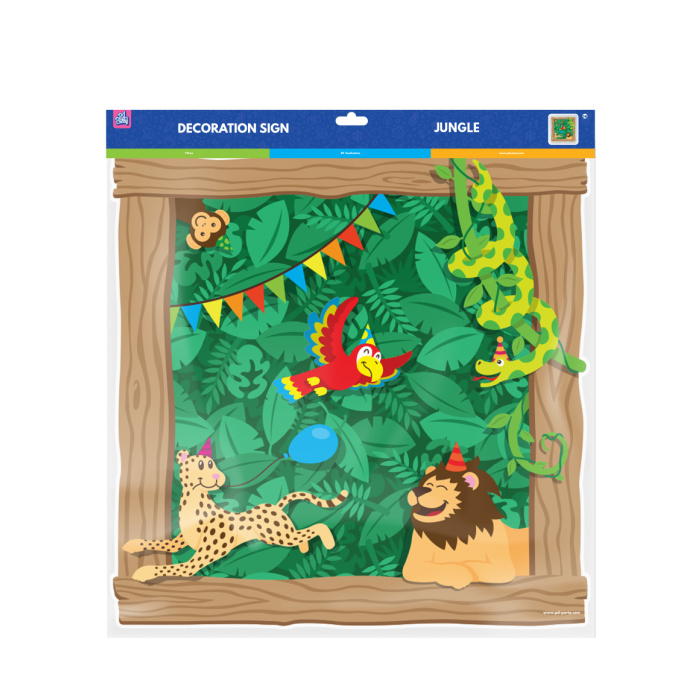 De Jungle decoration signs zijn speciaal gemaakt voor kinderfeestjes met als thema de jungle. Deze grote huldeschilden zijn met 50 x 50 centimeter de perfecte decoratie aan deuren en ramen zodat men direct ziet dat er een feestje is. Dit huldeschild in jungle-stijl is gemaakt van karton met een plastic laagje. Combineer ze met de jungle ballonnen, vlaggenlijnen, party tape en swirls en je hebt alles in huis voor het perfecte kinderfeestje!